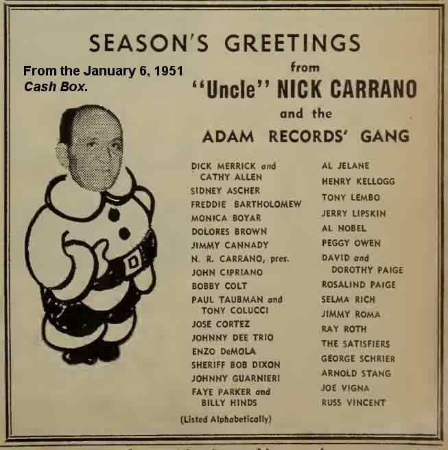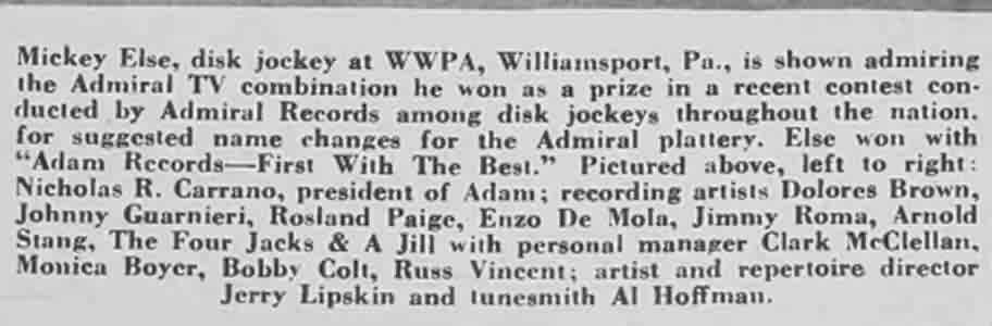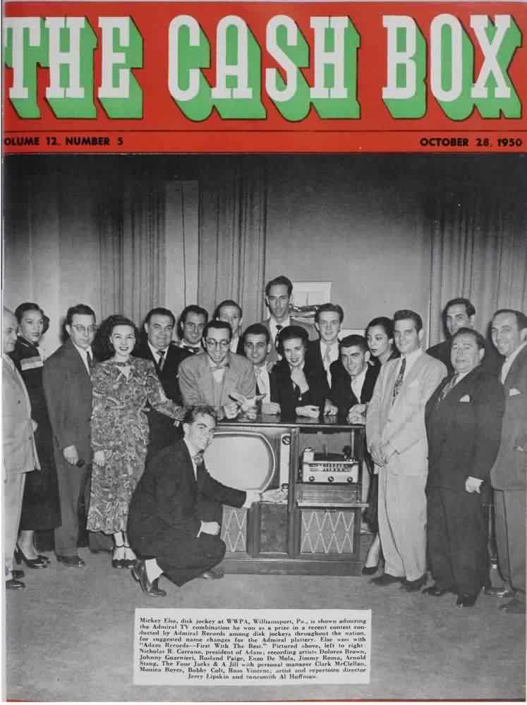 The Big Time: Dolores made the cover of the October 28, 1950 Cash Box. (Of course, there were 18 other people in the photo, including comedian Arnold Stang and the Four Jacks & A Jill. Don't feel bad; how many times has your picture been on the cover of Cash Box?) The caption talked about DJ Mickey Else having won an Admiral television. Admiral Corporation (the electronics company) successfully got Admiral Records to change its name. Else was the one who came up with the new one: "Adam Records - First With The Best". Supposedly, Dolores was one of the Adam Records artists (her name was listed in their holiday message, printed in the January 6, 1951 Cash Box), but there were never any Dolores Brown releases on the label.