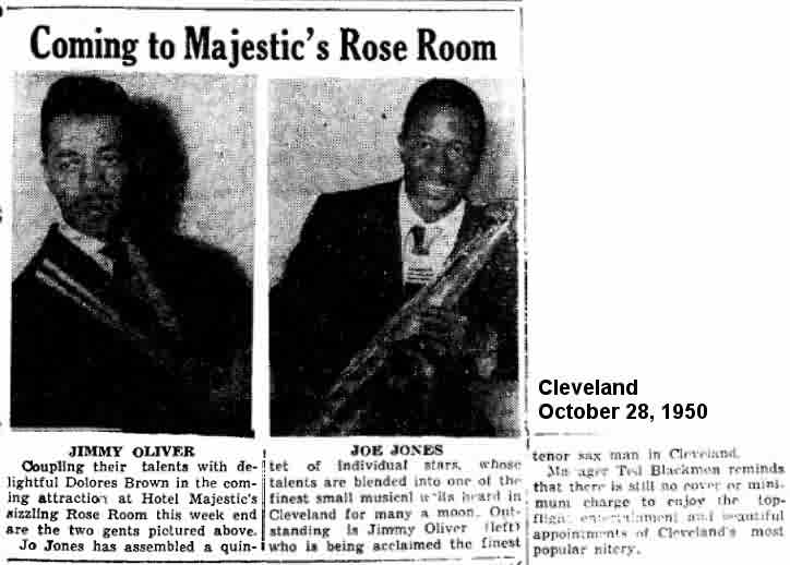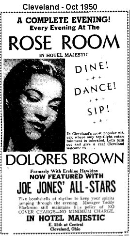 Beginning the weekend of October 28, 1950, Dolores appeared at the Rose Room, in Cleveland's Majestic Hotel, along with sax player Joe Jones' quintet. The November 4 Cleveland Call And Post wrote about the show: "The Joe Jones combo, featuring Jimmy Oliver, saxophonist supreme, is a nightly presentation. The current starring attraction is Miss Dolores Brown, glamorous vocalist and recording star formerly with Erskine Hawkins."