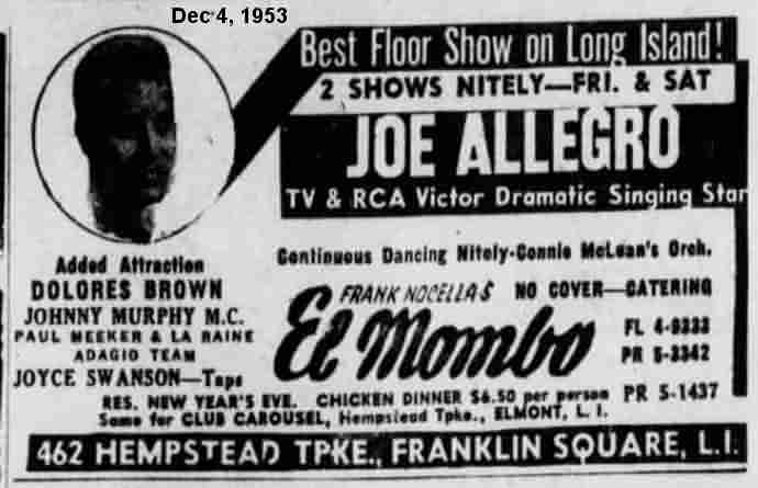 In early December 1953, Dolores appeared at the El Mombo Club in Franklin Square, Long Island. [That spelling is straight from their ad.]
