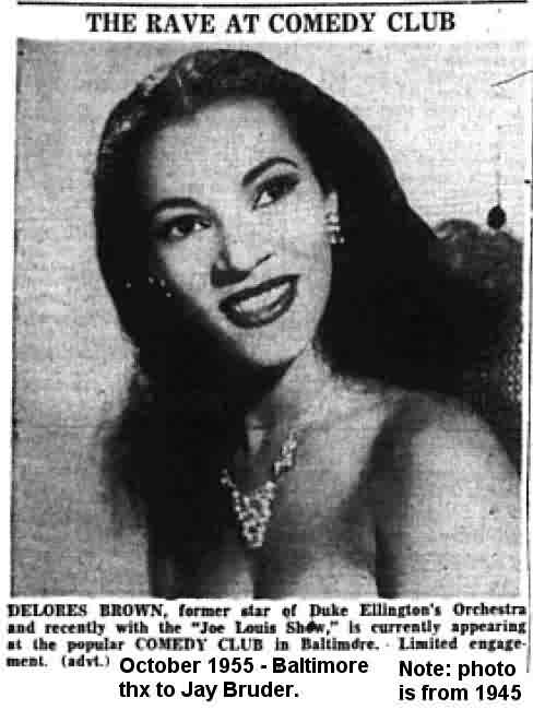 In mid-October 1955, she was at the Zel-Mar in Philadelphia. After that, she appeared at the Comedy Club in Baltimore. The little blurb in the October 29 Washington Afro-American (actually an ad disguised as a "news item") said: "DELORES BROWN, former star of Duke Ellington's Orchestra and recently with the 'Joe Louis Show', is currently appearing at the popular COMEDY CLUB in Baltimore. Limited engagement." This is the last we'll hear of Dolores as a performer for a long while.