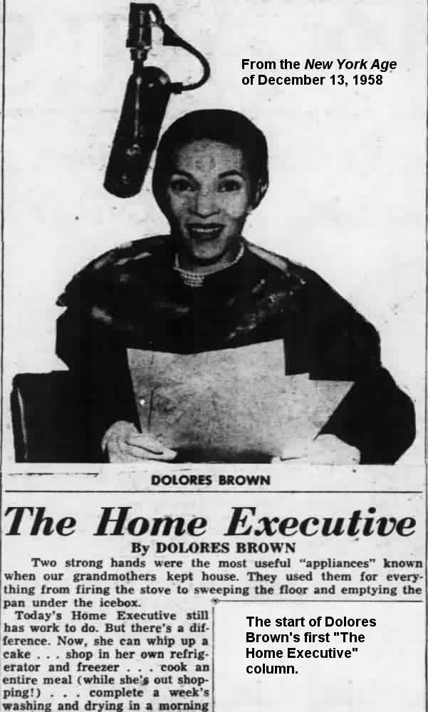 Not only was she going to have a radio show, she also got a column in the New York Age called "The Home Executive". "Join the HOME EXECUTIVE CLUB," ran the ad in the December 6, 1958 New York Age, "and receive a free gift from me. If you are not a member, just put your name and address on a postcard and mail it to Miss Dolores Brown, c/o The New York Age, 15 West 125th Street, New York 27, N.Y." Not terribly politically correct by today's standards, her first column told the ladies how to prepare food for their husbands. The by-line was "Dolores Brown (The Girl Who Stepped Out Of A Song And Into A Home)". Half of the second column was taken up by a history of cooking!