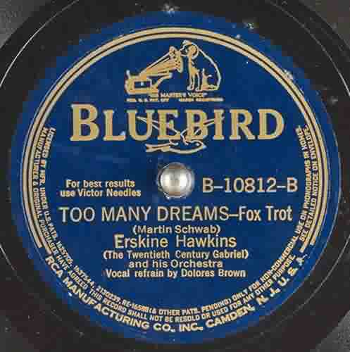 Bluebird released "Too Many Dreams" in August 1940. (It showed up in an August 10 RCA Victor / Bluebird ad. "Magnetize your machines with the music that nabs the nickels!") The flip, an instrumental called "Dolomite", refers to the name of a community in Birmingham, Alabama, Hawkins' home town.