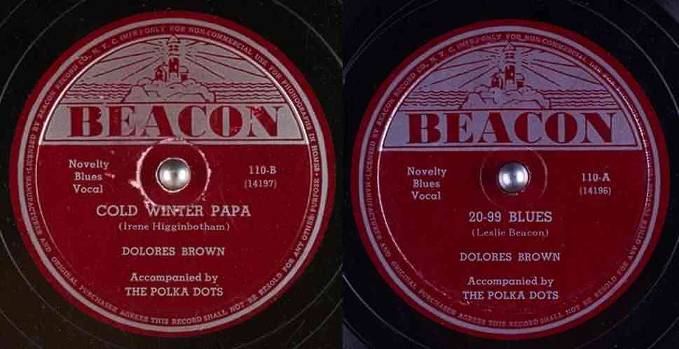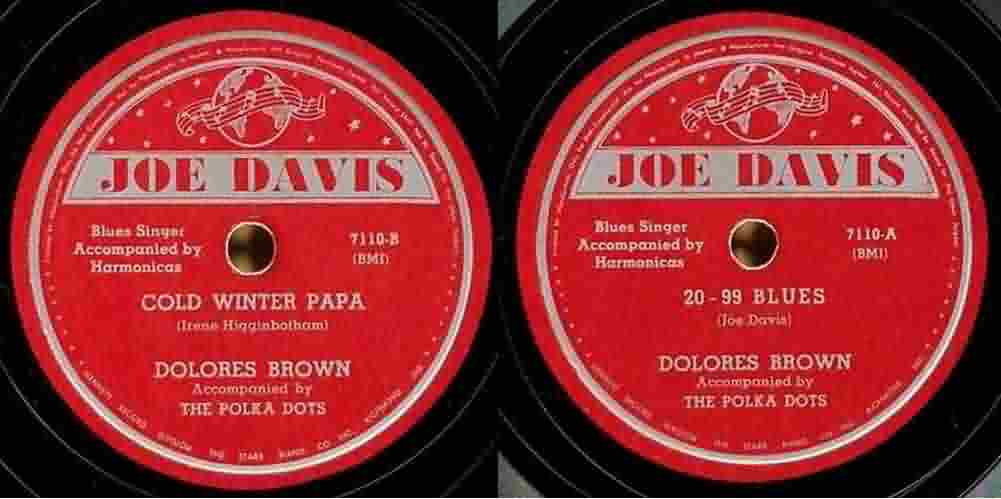 There was no further mention of Dolores Brown until she turned up on a couple of recordings done for Joe Davis (who had written "S'posin'") in December 1942 and released on his Beacon label in January 1943: "Cold Winter Papa" and "20-99 Blues". These, to me, are ghastly, although that's not Dolores' fault. In August 1942, James C. Petrillo, head of the American Federation of Musicians, placed a ban on union musicians doing any recording; it would remain in effect for about a year. So, record producers were stuck. They either released recordings made prior to the strike, recorded singers a cappella, used non-union musicians (or ones who pretended to be, recording under different names [see my Red Caps article]), or got around the ban by using instruments that the union didn't recognize as being "serious". One of those was the harmonica, and on these songs, Dolores was backed up by the Polka Dots, four harmonica players: Frank Andriello, Hy Dolber, Ralph Files, and Michael Chimes. "Cold Winter Papa" would have been a nice effort if she had had a decent band behind her.