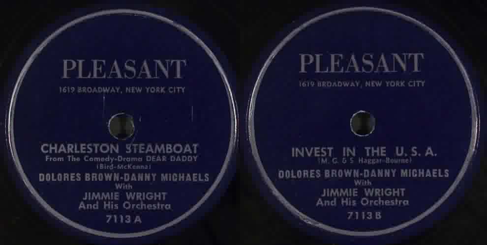 In September 1950, a new Dolores Brown record appeared, this time on New York's Pleasant label: "Charleston Steamboat", backed with "Invest In The U.S.A.". Both of these were duets with Danny Michaels, who'd been a pianist with Erskine Hawkins. The sides also feature Jimmie [sic] Wright & His Orchestra. "Charleston Steamboat", says the label, was "From The Comedy-Drama DEAR DADDY", of which I can't find a trace on either Broadway or in movies. The tunes have intriguing titles, but these are the only Dolores Brown sides I've never heard.
