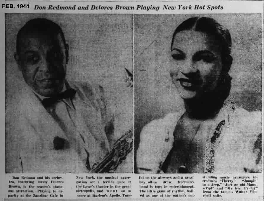 Dolores Brown, who replaces her, has a wide reputation as a swing singer and is ideally suited for Hawkins' band. A frequent feature at the Apollo Theatre where she is a great favorite [other than unknown Amateur Night appearances, she'd only been there once], she broke into headline print early this summer [sic; they meant last summer] when Duke Ellington selected her to sing with his band.