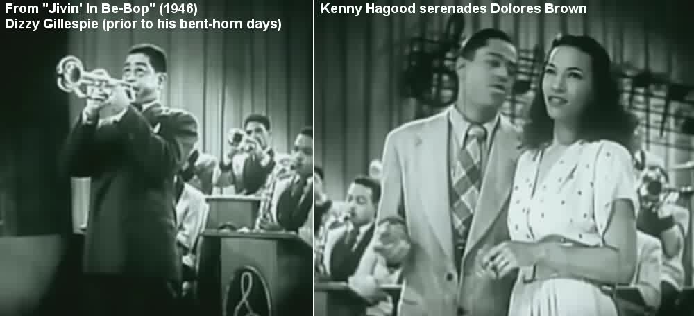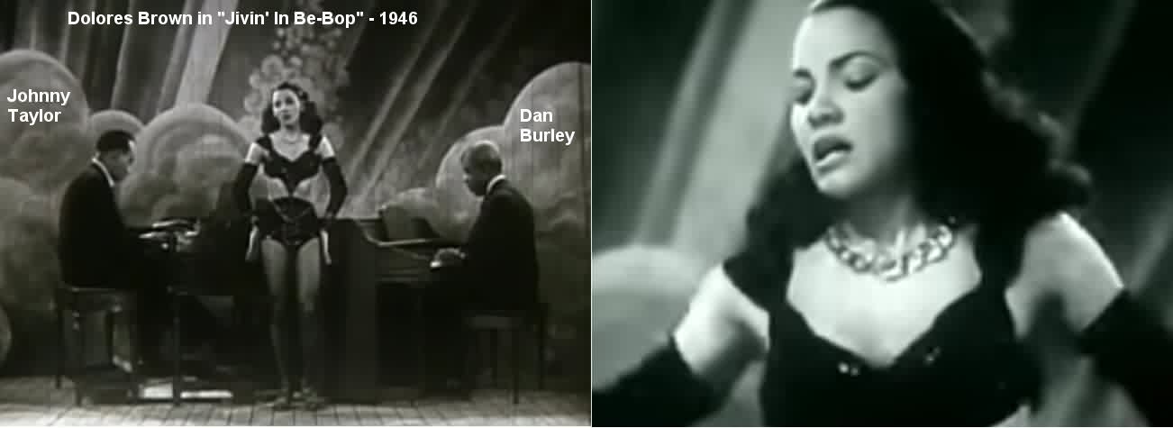 Movie time. In late 1946, Dolores Brown was in "Jivin' In Be-Bop", a revue (that is, just acts performing) starring Dizzy Gillespie's orchestra, Helen Humes (singing "Be-Baba-Leba"), Kenny Hagood, and exotic dancer "Sahji". Filmed in the Bronx (the other movie capital of the world), Dolores' first appearance consisted of simply standing there while Kenny Hagood (Gillespie's vocalist) sings "I Waited For You" to her. I guess she got paid for that. At the end of the film, she dances in a fairly boring routine, not helped by the dull music of Dan Burley on piano and Johnny Taylor on organ. (While some sites claim the dancer in that number is Sahji, it's really Dolores.)