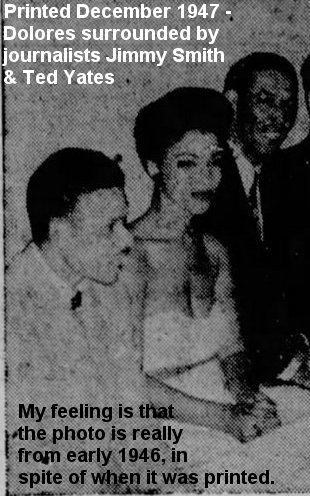 A photo of Dolores and Erskine Hawkins, with several members of the press, appeared in the December 6, 1947 Alabama Citizen. The caption began with "In conjunction with his leaving the swank Hotel Lincoln in New York where he created a sensation with his popular orchestra, Erskine Hawkins feted the pick of the metropolitan press [which, strangely, included not a single white reporter]." The paper date is correct, but it's probable that the photo was actually from January 1946, nearly two years earlier.