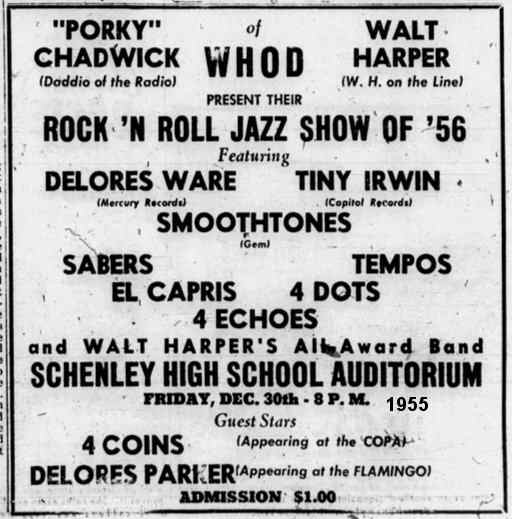 On December 30, 1955, the El Capris were one of the acts that appeared, with Porky Chedwick, in the "Rock 'N Roll Jazz Show Of '56" at the Schenley High School Auditorium. Also there were the Smoothtones (on Gem), Delores Ware, Tiny Irwin, the Sabers, the Tempos, the 4 Echos, and more famous guests: the 4 Coins and Delores Parker.