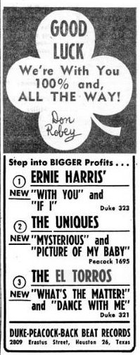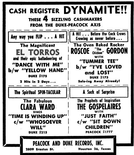 One night, in 1957, the El Toros were doing a show at the Club Riviera, when Bobby Bland and Junior Parker were in the audience. (They were in town as part of a package tour from Duke/Peacock Records: the Buffalo Booking Agency's "Blues Consolidated" Show.) Bland and Parker were impressed, and invited the guys back to their hotel to hold an impromptu a cappella audition. When this went well, Bland called up Don Robey, owner of Duke/Peacock, and told him of their discovery; Robey immediately asked for a demo tape.