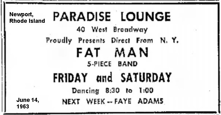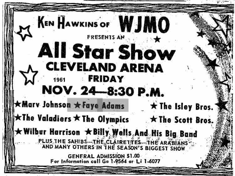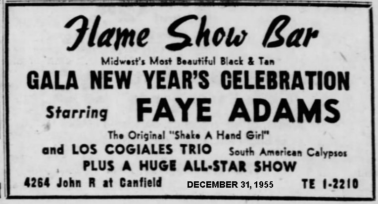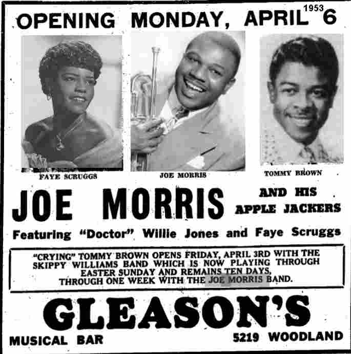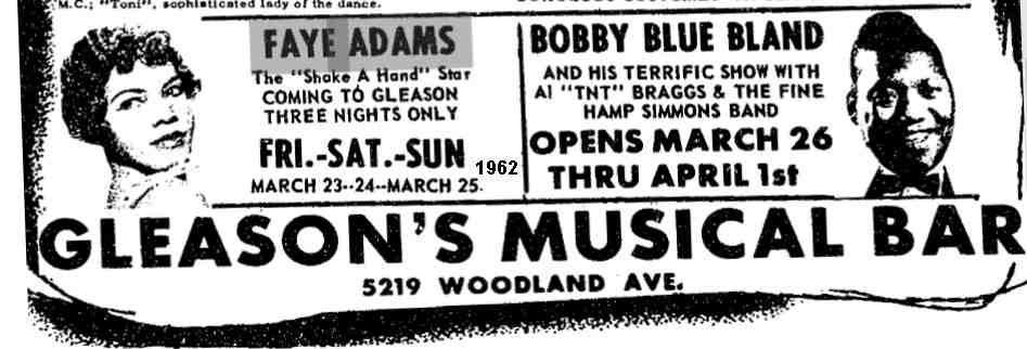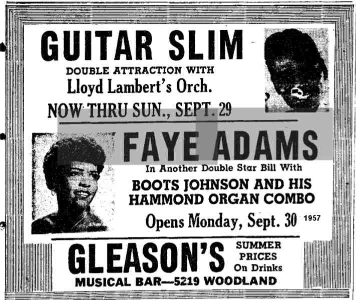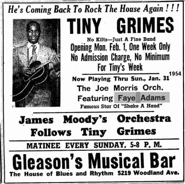 Al Howell, manager of Gleason's Musical Bar, the "House That Jap Built" [it was owned by William "Jap" Gleason], at 5219 Woodland Ave., informs that Faye Adams is just a new name for a singer we have always known as Faye Scruggs, who sings with the Joe Morris orchestra.