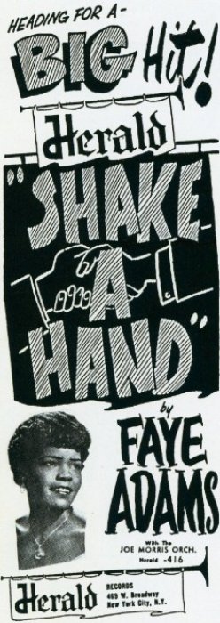 The headline in the January 9, 1954 New York Age screamed: "Come On 'Shake A Hand' With Faye At The Apollo". It continued (and the first sentence is [sic]): "The year 1953 saw still another entertainment star born at the Apollo the famous amateur program to great stardom and waxing the years greatest 'Rhythm and Blues' Disk, 'Shake A Hand,' lovely little Faye Adams established herself as a topnotcher. Her current hit, 'I'll Be True' currently is heading for the top of popularity lists all over the country.... When the song stylist copped first prize on the Apollo theatre amateur hour, she was promptly [only a mere dozen years later] signed by Joe Morris, who immediately formed a new band to the unknown girl. Almost miraculously, their first [well, almost] combined effort, 'Shake A Hand' was a juke box bonaza [sic]. It was aired from one end of the country to the other." Seriously, who writes this junk?
