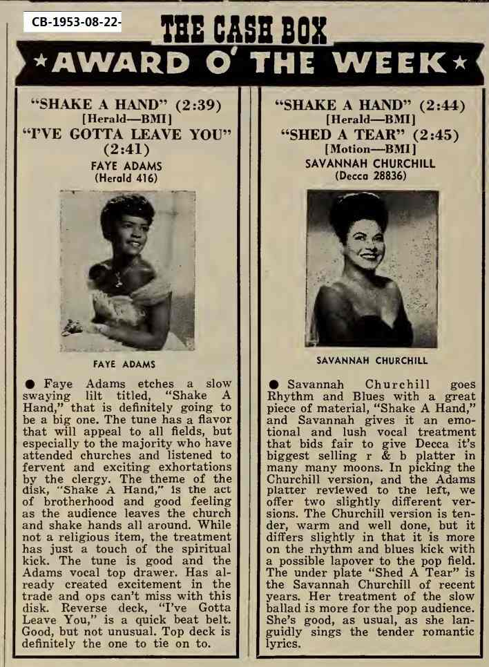 The August 22, 1953 Cash Box gave it's "Award O' The Week" to "Shake A Hand" (both the Faye Adams and Savannah Churchill versions). Of Faye, they said: