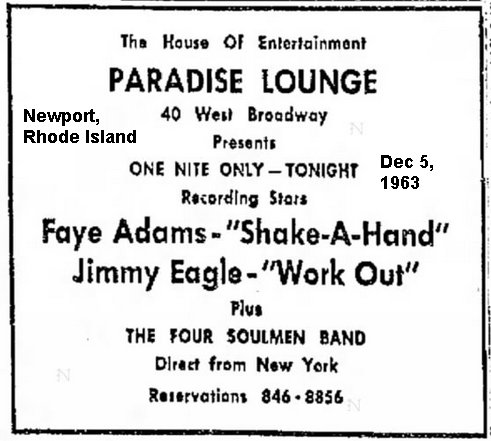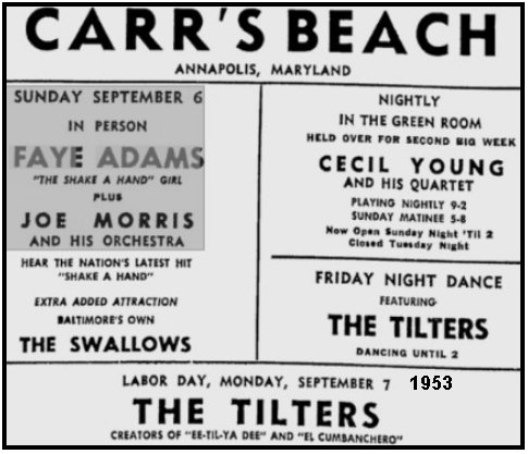 Through his contacts, [manager Fred] Logan sent them off to various record companies to do backup work. This got them right to the top: they kind of had a number one record in the fall of 1953. Unfortunately they never received any label credit, but they were the group behind Faye Adams on "Shake A Hand." Said Herb, "Somehow we got an audition in Atlanta, Georgia with Herald Records. While in Atlanta, we played the Royal Peacock with Ivory Joe Hunter, Sonny Thompson, Big Maybelle and Faye Adams."