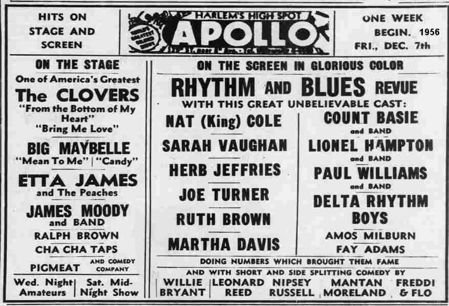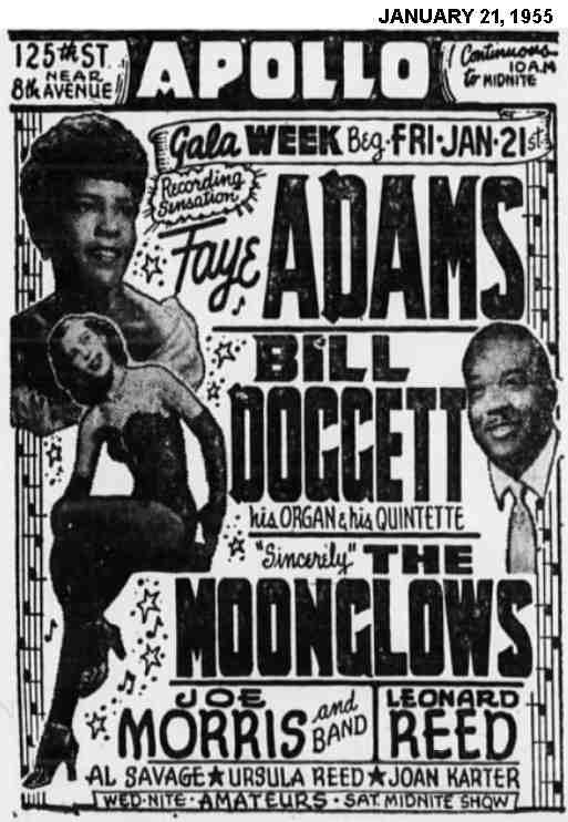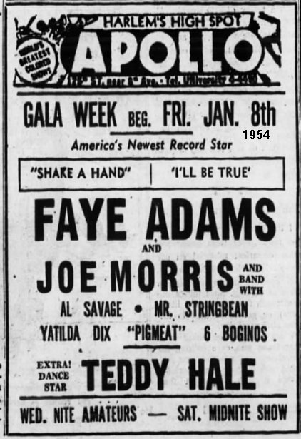 It had taken her 15 years, but Faye was finally back at the Apollo Theater. Beginning the week of January 8, 1954, she and Joe Morris (with his male singers, Al Savage and Mr. Stringbean [Johnnie Williams]) shared the stage with Yatilda Dix, Pigmeat Markham, Teddy Hale, and the 6 Boginos.