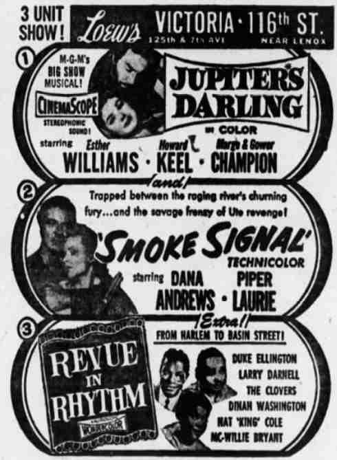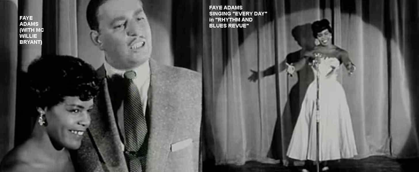 I don't know exactly when she did it (probably in early April), but Faye filmed "Every Day" and "Somebody Somewhere" for inclusion in the series of shorts that Studio Films was creating to be shown on television (however, at the time, they couldn't find a TV station that would air them). Loew's agreed to show one of them (but I don't know which) at their Victoria theater in Harlem for the week beginning April 8, 1955. Called "Revue In Rhythm", it would be a short running with the regular feature, "Jupiter's Darling". These shorts would eventually end up as the Showtime At The Apollo series (although they had nothing at all to do with the Apollo Theater). Some of them (including Faye's "Every Day") would be put together as the 1955 movie Rhythm & Blues Revue and others (including Faye's "Somebody Somewhere") ended up in the 1956 movie Basin Street Revue (which was showing all over the country beginning in late August 1956).