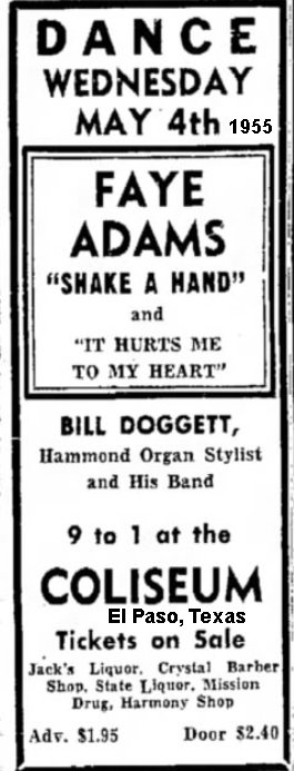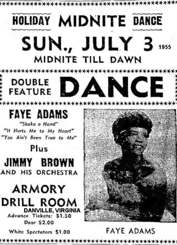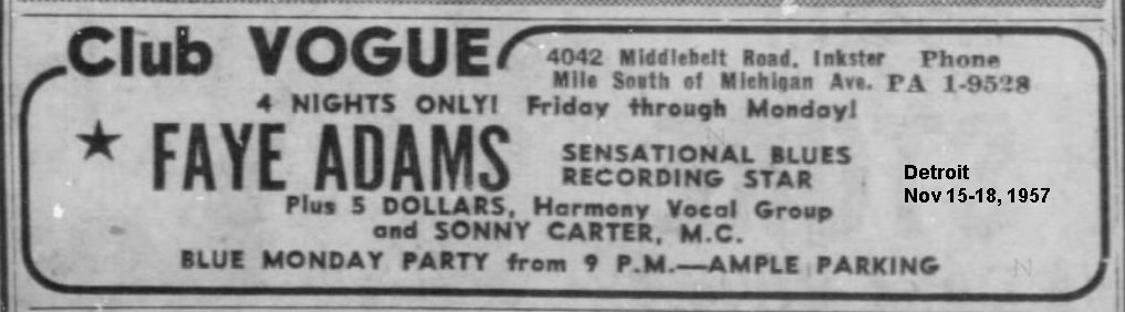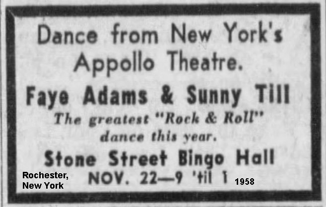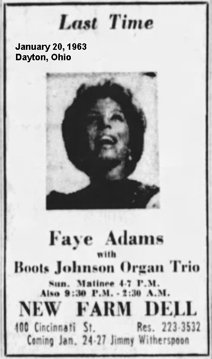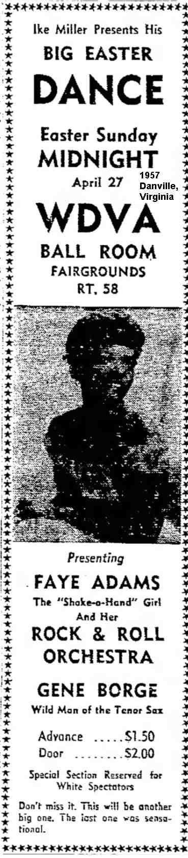 Sometime after that (still in March) they played a dance at the Edwards Hall in Erie, Pennsylvania, but it didn't turn out too well. Said the March 27 Pittsburgh Courier: "Blues singer Faye Adams would like to do more than 'Shake A Hand' at the promoters of a dance in Erie, Pa., last week where she was supposed to be the star attraction. But, without her knowledge, a small back room was being used for gambling, which not only drew the customers, but also a raiding band of police. And nobody got paid!"