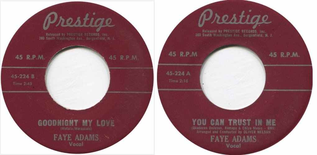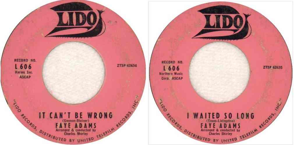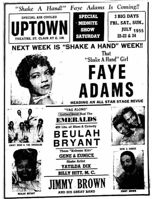 The December 9, 1954 Jet reported (in Major Robinson's highly-unreliable gossip column): "As soon as she bought a new Cadillac, Faye (Shake A Hand) Adams had her picture painted by an artist on both doors." That one could be true.
