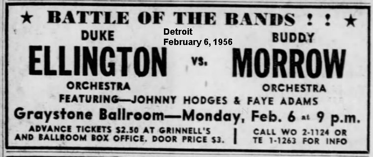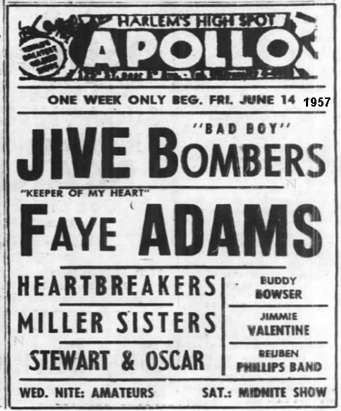 They then journeyed to Buffalo, New York (unknown venue), where the following took place (as reported in the April 10 Pittsburgh Courier): "Blues singer Faye Adams was an unhappy bystander last week during the Cain and Abel battle which Joe Morris and his band-managing brother staged up in Buffalo. When the aggregation returned to New York the brothers once again came to blows and the band manager took a trip to the hoosegow after he bit the policeman who arrived to quell the family squabble."