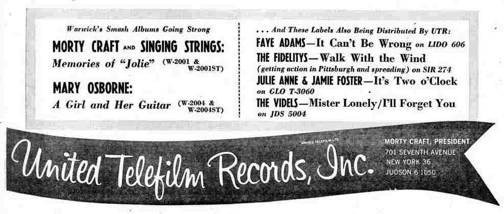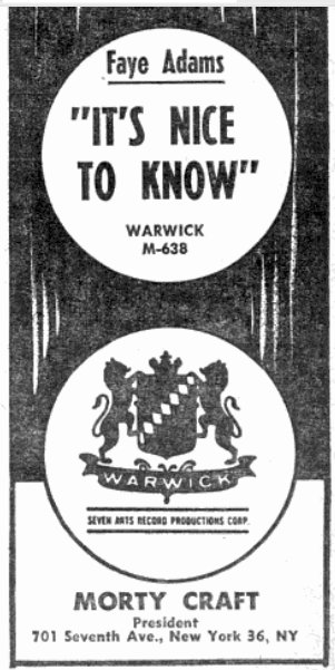 When the set-up at Herald was made, Jack Angel was appointed president, Al Silver vice president and Jack Braverman, treasurer. Then the company immediately entered into an agreement with Jack Angel for his recording of "Paradise Hill" by the Embers and released it on the Herald label. Since its release, the platter has sold a reported 25,000 and is still said to be moving well. Not long afterwards, the diskery got together with ork leader Joe Morris and signed him to an exclusive recording contract with Herald. With the Morris aggregation was a vocalist named Fay [sic] Scruggs. On her personal appearances for the past few months, Fay had been singing a song called "Shake A Hand." The execs of the company heard Joe and Fay do the number and immediately grabbed it and signed Fay Scruggs to a contract, changing her name to Fay Adams. A recording was made of "Shake A Hand" and after an intense promotion job on the wax, the number took off.