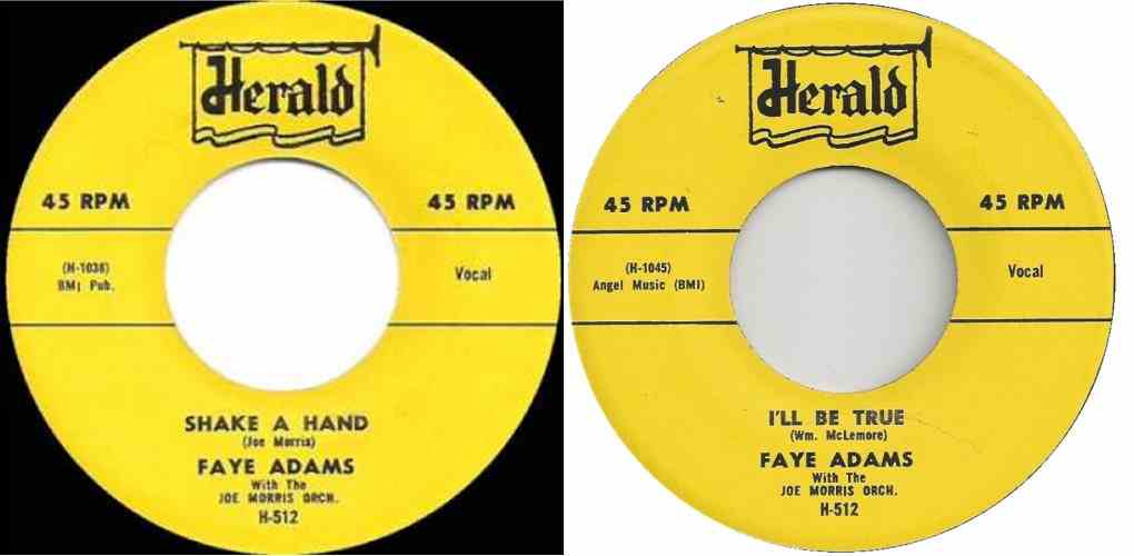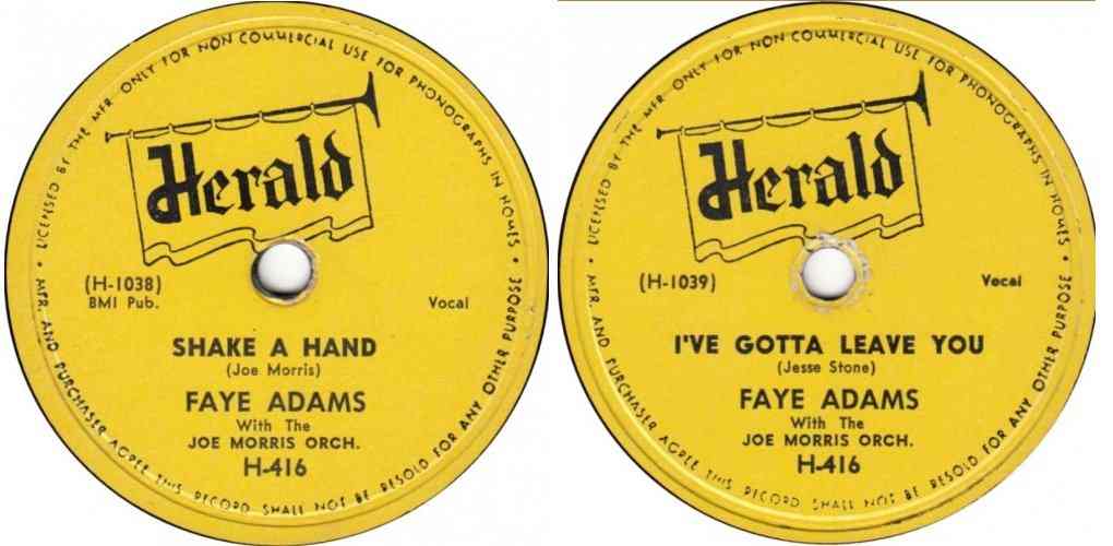 The August 1, 1953 Billboard noted that "There have been a number of artist switches in the r.&b. field over the past few weeks. Joe Morris, formerly on Atlantic Records, is now pacted with Herald. His first release will be called 'Shake A Hand.'" Later in the column, it also said: "Fay Adams [sic], formerly Fay Scruggs with Atlantic, is now with Herald Records." It's strange that columnist Bob Rolontz, who was really up on the music industry, didn't connect the two events.