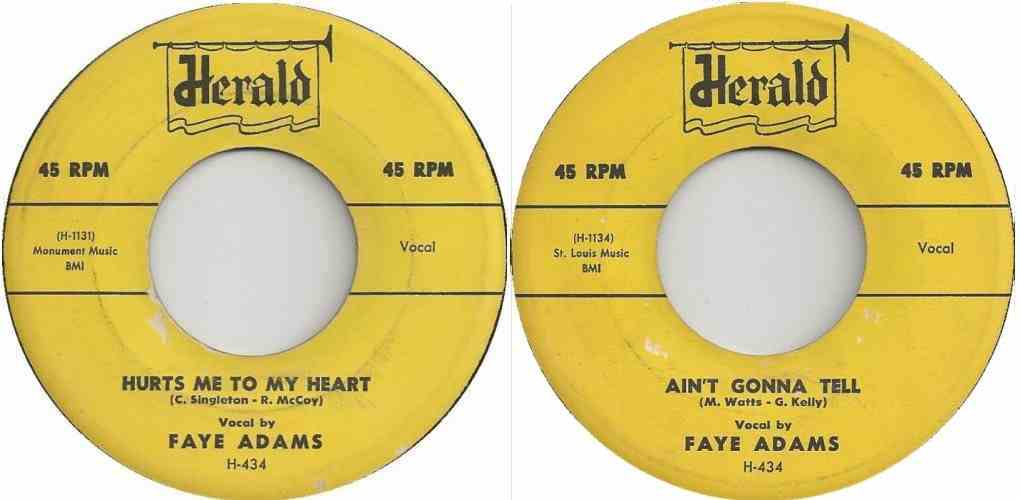Also in August, Herald released "Hurts Me To My Heart" and "Ain't Gonna Tell", two more songs done without Joe Morris. "Hurts Me To The Heart" [sic] was listed in the "This Week's Best Buys" column of the August 21, 1954 Billboard: "It looks as tho Faye Adams has come up with another good one. The platter is getting attention thruout the country, and is particularly strong in the South. The record showed up on the Rhythm and Blues National Best Sellers Chart for the first time this week."