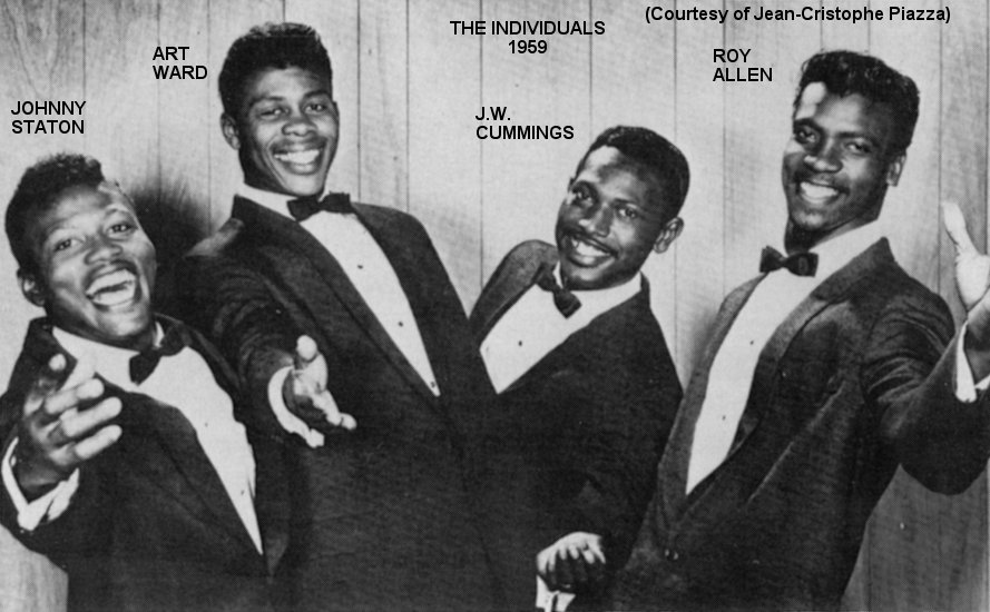 By 1959, Johnny had given up on the name "Feathers," having formed a group called the "Individuals." They consisted of: Roy Allen (tenor), Joe "J.W." Cummings (baritone), and Art Ward (bass). They recorded a novelty tune called "Jungle Superman" for Peter Morgan (yes, Show Time was still around). This was in a Coasters/Olympics "playlet" vein. The flip was "I Met Her At A Dance," although when Morgan re-released "Jungle Superman" a few months later, the flip had changed to a nicely-done remake of the Feathers' "Dear One."