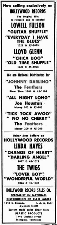 It's bad enough that they listened to Otis and walked out on their contract with Morgan, but to add insult to injury, at the very end of November, Aladdin released its version of "Johnny Darling" to compete with the Show Time version! A trade paper noted that Aladdin had taken over the Feathers' recording of "Johnny Darling," in the mistaken belief that the masters had been leased by Aladdin for national distribution, rather than that the song had been re-recorded. Actually, if you're not listening too closely, the two versions sound very much alike (although Aladdin added some nice vibes, presumably played by Johnny Otis).