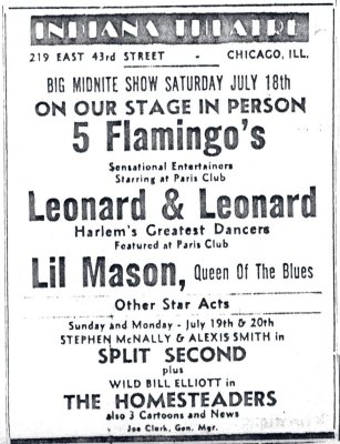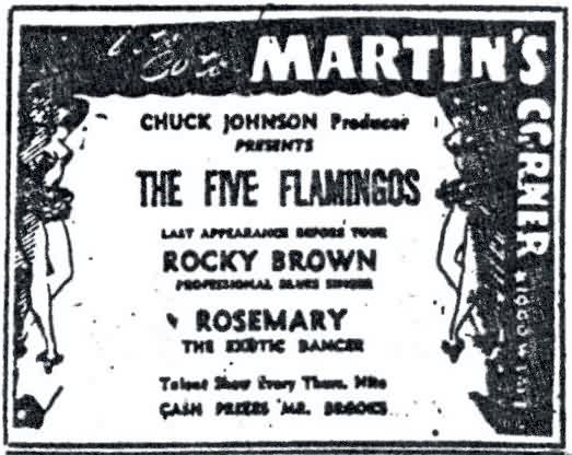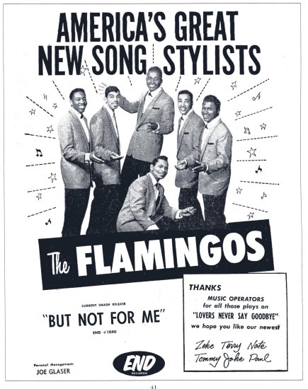 On Labor Day 1953, the Flamingos appeared at Chicago's Park City Bowl (a skating rink owned by Jimmie Davis, future owner of Club 51 Records). Also on the bill were Cleveland's Coronets and the Sonny Stitt Orchestra.