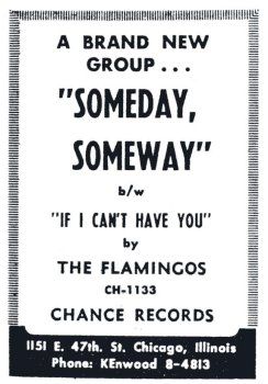 In a January 1952 blurb in the trade papers, Savoy Records of Newark, New Jersey, announced the signing of the Flamingos. Whoever that group was, it wasn't the guys from Chicago and, in fact, nothing was ever issued on Savoy by any group with that name.