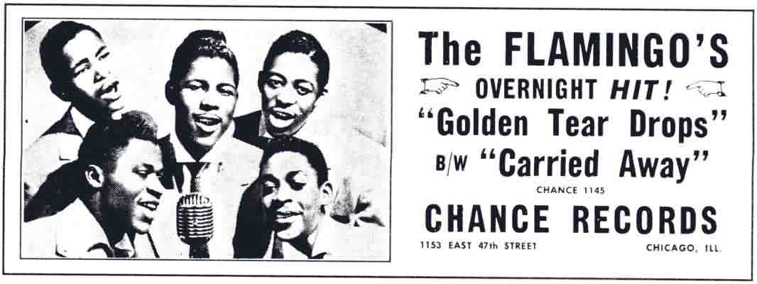 Out of the blue, on January 2, 1954, the trades made "Golden Teardrops" a Tip in New York, but there was no further national chart action for it. Later in January, the Flamingos appeared at Chicago's Rainbow Gardens. On January 29, they were part of the "Flamingo Concert", hosted by DJ McKie Fitzhugh at the Corpus Christi Auditorium (Chicago). Also on the bill were the 5 Echoes (with the Flamingos' old lead, Earl Lewis) and the 5 Thrills.