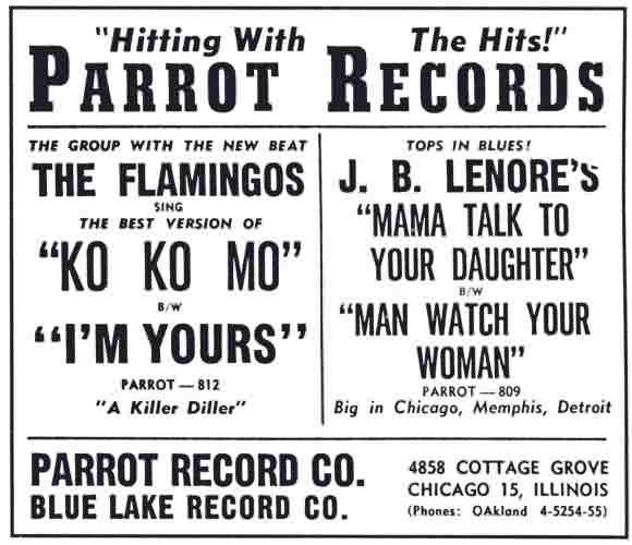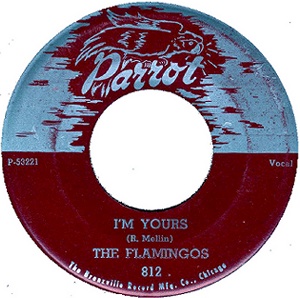 Also in January, Parrot released the third Flamingos record: "Ko Ko Mo"/"I'm Yours". "Ko Ko Mo" was a cover of the Gene & Eunice original, while "I'm Yours" covered Don Cornell's big Pop hit. The platter was reviewed on February 5 ("Ko Ko Mo" being ranked "excellent"), along with the 5 Keys' "Close Your Eyes", Dinah Washington's "That's All I Want From You", the Charms' cover of the Flamingos' cover of "Ko Ko Mo", the Orioles' "I Love You Mostly", the Cadillacs' "No Chance", the Strangers' "Dreams Came True", Mac Burney & 4 Jacks' "Tired Of Your Sexy Ways", the 5 Royales' "You Didn't Learn It At Home", and the Gems' "I Thought You'd Care". On March 5, "Ko Ko Mo" was a Tip in Chicago (as was Gene & Eunice's original version).