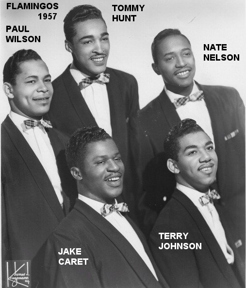 Finally, on Christmas Eve, Terry Johnson got the call to join the Flamingos! All he had to do was meet Jake in Philadelphia the next day. Piece of cake! The Flamingos were a quintet again: Nate Nelson (first tenor), Tommy Hunt (second tenor), Paul Wilson (baritone), Jake Carey (bass), and Terry Johnson (tenor and guitar).