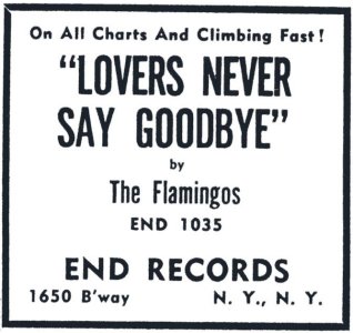 Their first outing on End gave us "Lovers Never Say Goodbye" (a duet lead by Terry and Paul) backed with "That Love Is You" (led by Nate). They were reviewed on October 27 (with "That Love Is You" receiving an "excellent"). Other reviews that week were for Chuck Berry's "Sweet Little Rock And Roller", the Imperials' "So Much", Fats Domino's "Whole Lotta Loving", the Cadillacs' "Peek-A-Boo", Jackie Wilson's "Lonely Teardrops", and the Charms' "My Friends". On November 24, "Lovers Never Say Goodbye" was a Tip in St. Louis. It ended its run at #52 on the Pop charts and #25 on R&B.