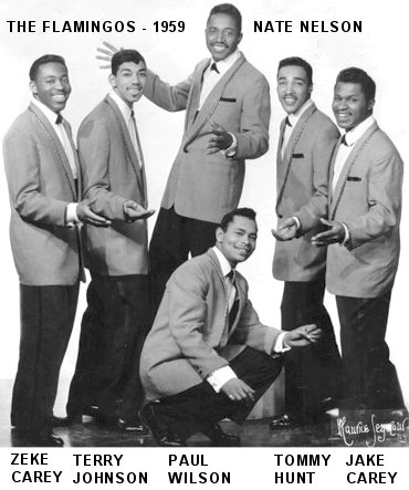 One day in the fall of 1954, the Flamingos met up with a first tenor named Nate Nelson (who was Sonny Til's first cousin). According to Johnny Carter, Sollie was getting a swelled head and just wasn't fitting in anymore. Nate started hanging around and they made him a sixth member. Although the Flamingos were now a sextet, there were only ever five on stage at once: Sollie and Nate alternated, sharing a uniform (coincidentally, Nate and Sollie were the same size). Since Nate had already been in the Navy, the others felt safe that their lead singer wouldn't be drafted. [Nate Nelson (born April 10, 1932) came from a local non-recording group called the Velvetones (Nate Nelson, Lee Diamond, Roy Flagg, Donald Blackman, and Winfred Veal).]