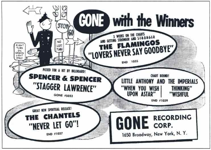 However, they were the Flamingos and wouldn't stay out of the music scene for long. In September 1958, they began a long and fruitful relationship with George Goldner's End Records. But it almost didn't happen. "Richard Barrett had to talk Goldner into taking us," remembers Terry. Goldner was doing well with Little Anthony & the Imperials and the Chantels at the time and it took Barrett a few weeks to convince him.