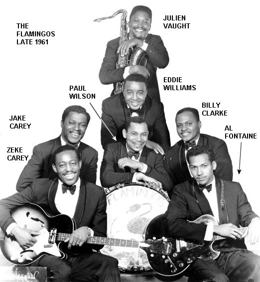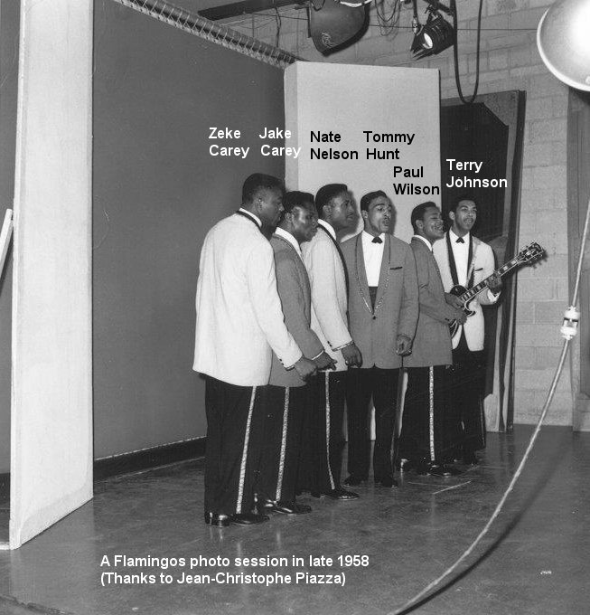 But Terry Johnson stepped in. Since he played the guitar, he argued, if he taught Zeke to play the bass, it would make them more of a self-contained group. This was a convincing argument. Terry also inspired Nate and Tommy to pick up instruments (drums and piano, respectively) and the Flamingos became a six-man vocal/instrumental group: Nate Nelson, Tommy Hunt, Jake Carey, Paul Wilson, Zeke Carey, and Terry Johnson.