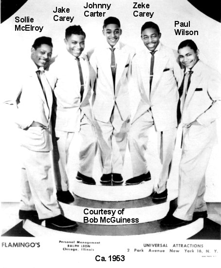 Zeke had a job at Montgomery Ward, where one of his co-workers was Fletcher Weatherspoon. One night in early 1952, Weatherspoon attended a talent show at the Willard Theater. He was very impressed with a tenor on the bill named Sollie McElroy. Sollie had been born in Gulfport, Mississippi (on July 16, 1933), but his family moved to Chicago when he was 15. He occasionally sang in the church, but wasn't really into it. More than anything, he wanted to be an entertainer. While he admitted to listening to Bill Kenny and the Ink Spots, Sollie pretty much developed his own style because he wanted to "do something for himself".