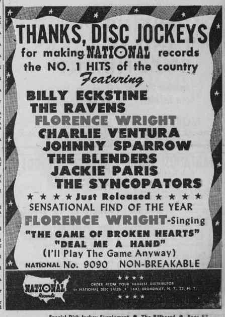 She was 'discovered' by A. B. Green, head of National Records, who heard her humming in the background during a disc jockey session being conducted by Bill Cook on a Newark station.The next day Florence had a five-year contract with the recording firm and already has cut two sides: "Deal Me a Hand (I'll Play The Game Anyway)", and "Nobody Wins In the Game of Broken Hearts", due for an early release.
