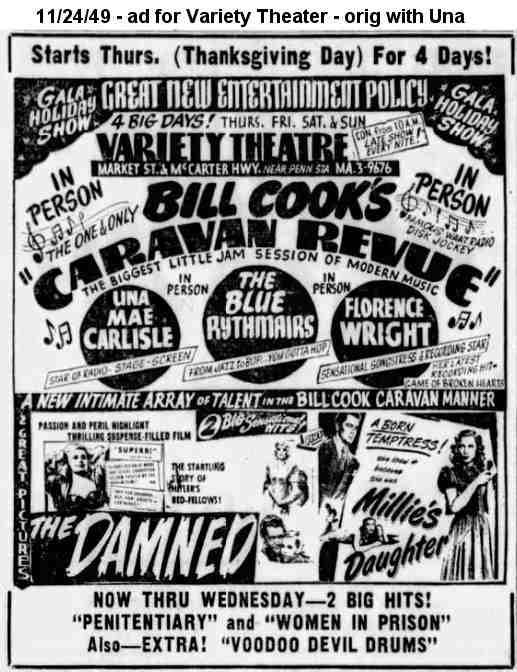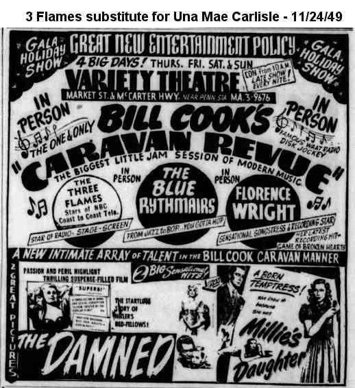 Florence's first known appearance was when she played Newark's Variety Theater from November 24-27, 1949. The show was Bill Cook's "Caravan Revue", starring Una Mae Carlisle, the Blue Rhythmaires, and Florence. However, Una was stricken with pleurisy right before the show and Tiger Haynes & the 3 Flames were quickly rushed in to replace her.