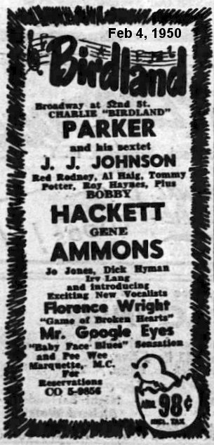 Florence was still at Birdland in February 1950, along with Charlie Parker, Bobby Hackett, Gene Ammons, and Mr. Google Eyes.