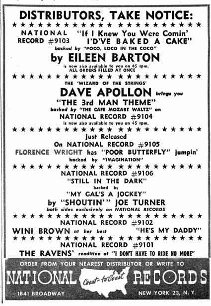 What I do know is that National released "(Roll 'Em) I'm Gonna Fade You With The Blues", backed with "I'll Never Let A Day Pass By", in October. For you non-gamblers, to "fade" is to cover the bet of the dice shooter in craps. They were reviewed in the November 11, 1950 Billboard: