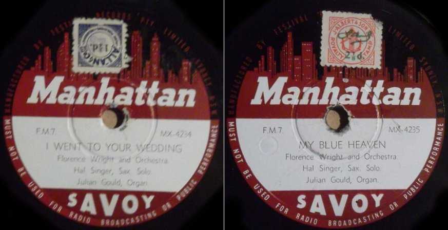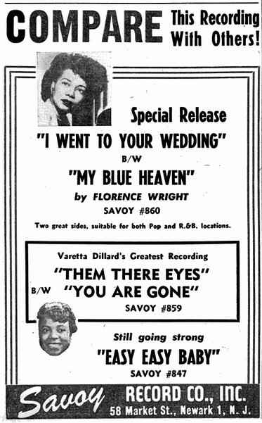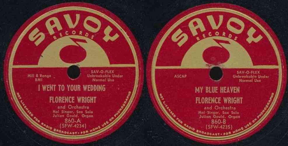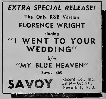 But that's the last we hear of Florence, until she recorded a couple of tunes for Savoy Records, almost two years later, on August 21, 1952: "I Went To Your Wedding" and "My Blue Heaven". "I Went To Your Wedding" was a cover of the #1 Patti Page tune, which was also done by the Red Caps, Little Sylvia, and Hadda Brooks that year. There were also versions by Sammy Kaye, Guy Lombardo, Grady Martin, Jimmy Wakely, and Hank Snow.