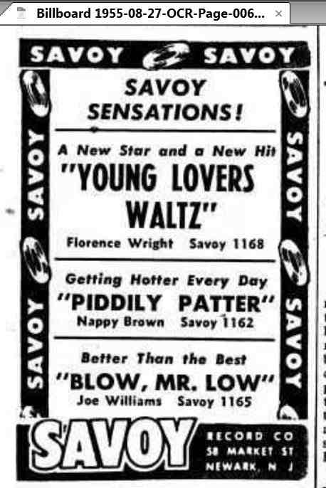 On August 3, 1955, she had one more session for Savoy, at which she recorded "The Young Lovers Waltz" and "To Wrong Is To Sin". Musicians present, most of whom you know, were: Budd Johnson (tenor sax), Ernie Hayes (piano), Leroy Kirkland (arranger), Mickey Baker (guitar), Milt Hinton (bass), and Panama Francis (drums). The sides were released on Savoy later that month (and also on Canada's Reo Records sometime that year). They were reviewed in the August 27 issues of both Billboard and Cash Box: