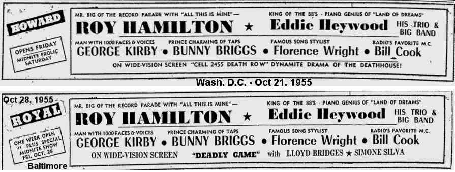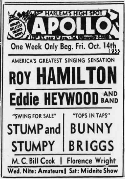 The Big Time. The week of October 14, 1955, Florence appeared at the Apollo Theater, along with Roy Hamilton, Eddie Heywood's band, Stump & Stumpy, and Bunny Briggs. Bill Cook was the MC. Owner Frank Schiffman's comment: "Satisfactory vocalist." For those who don't know, that was high praise from Schiffman. From there, the show went to the Howard Theater in Washington, D.C. (the week of October 21), and then to Baltimore's Royal (the week of October 28).