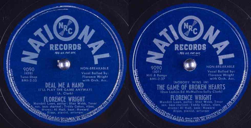 Cash Box (Award O' The Week): New chirp makes her bow on National wax and steps out in a blaze of glory to notch this featured spot via a smash disking if there ever was one. It's Florence Wright, a lass who certainly has a bright future if this first platter is any indication. Wax, titled "The Game of Broken Hearts" and "Deal Me A Hand", shows the thrush's pipes off to excellent advantage. Her sincere vocal strains spoon the lyrics of the top deck in a ton of meaningful tones that satisfy. Ditty is essentially a tender one, well loaded with pathos and sorrow. Miss Wright's recording of this tune, currently causing loads of attention in the music business, is top drawer material from start to finish. The flip, "Deal Me A Hand", spills in slow blues tempo and has the canary turning in another wonderful performance. Both sides of this platter should reap harvest for music ops, with "The Game Of Broken Hearts" leading the way!