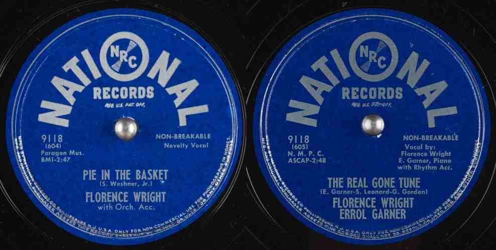 National comes thru with a successor to such novelty hits as "Bake A Cake", "Candy And Cake", and "Sunshine Cake" with a number called "Pie In The Basket". Florence Wright clicks with some cute lyrics. Miss Wright is joined on the plattermate, "Real Gone Tune", by the talented pianist, Erroll Garner. A jazz tune all the way.