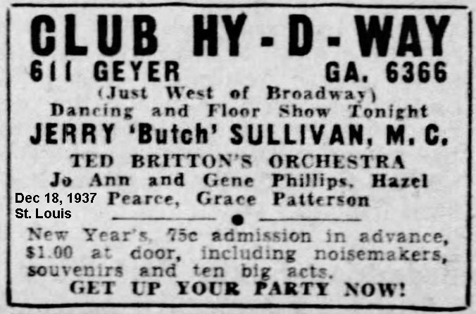Gene was seemingly back in St. Louis by December 1937. There's an ad for Club Hy-D-Way, which featured Ted Britton's Orchestra (the house band from October 1937 through March 1938). The relevant part of the ad names the acts; one of them is "Jo Ann and Gene Phillips". Who was Jo Ann Phillips? I have no idea. This is her only mention; she never turns up anywhere else, he had no siblings, and I can't find any marriage record to someone who might be her. Technically, the way these ads are put together, it could have been Gene Phillips together with someone who was just known as "Jo Ann", not "Jo Ann Phillips".