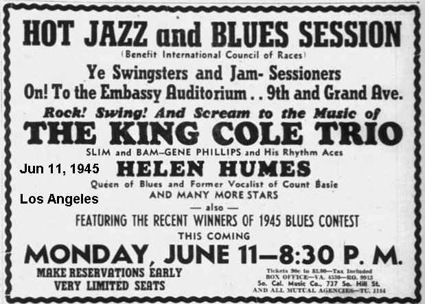On June 11, 1945, the Rhythm Aces appeared at the Embassy Auditorium along with the King Cole Trio, Helen Humes, and Slim & Bam. They're already keeping good company.