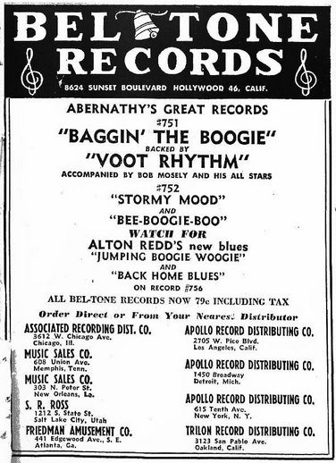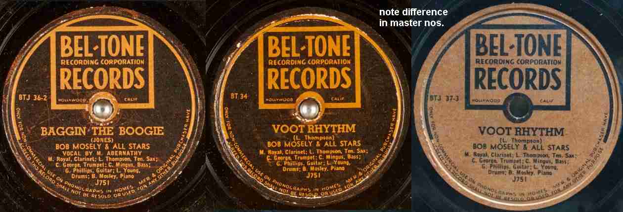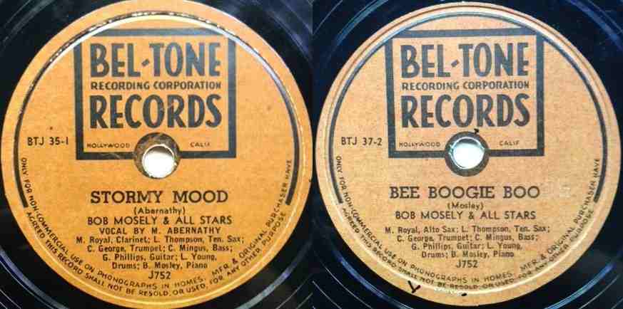 Bel-Tone released all the "Bob Mosely & All Stars" recordings in February 1946: "Baggin the Boogie" was coupled with "Voot Rhythm" and "Stormy Mood" was paired with "Bee Boogie Boo".