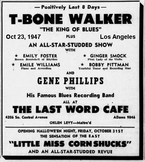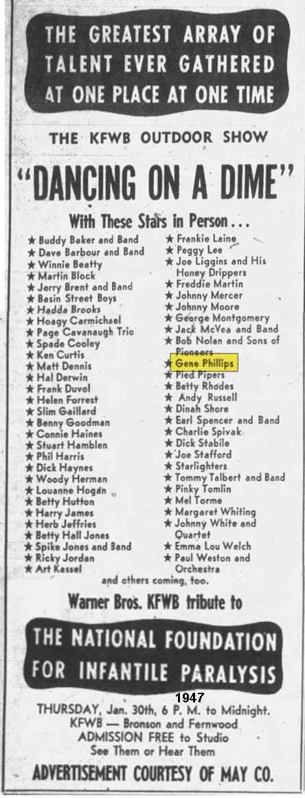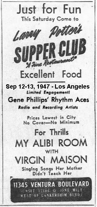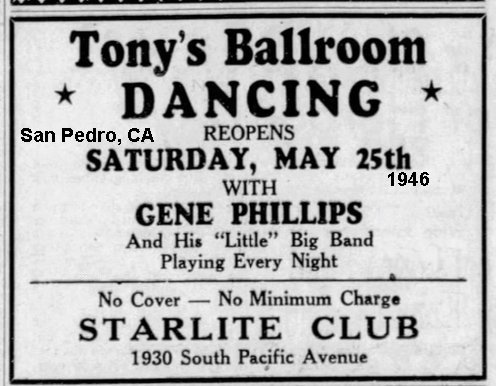 "Gene Phillips And His 'Little' Big Band" appeared at Tony's Ballroom in the Starlite Club (San Pedro; a neighborhood in Los Angeles) starting on May 26, 1946. This was the only time that name was used for the combo.